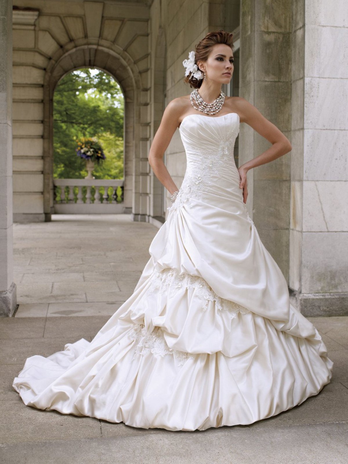 Mon Cheri strapless luxurious satin full A-line gown with softly curved neckline, directionally ruched bodice features delicate hand-beaded lace appliqué with three- dimensional flowers and back covered buttons, asymmetrically dropped waistline, side draped pick-up skirt features matching beaded lace and flower motifs, bubble hemline and chapel length train. Detachable spaghetti and halter straps included.